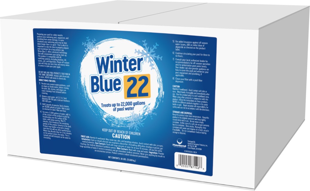 Haviland’s Blue 22 Winter Mix uses Sub-Zero crystals to protect against common winterizing problems and provides water softeners that make pool openings easier. Compatible with all sanitizing systems, it’s designed to help protect pool surfaces from staining and scaling over the winter. It now treats up to 22,000 gallons with a single application.