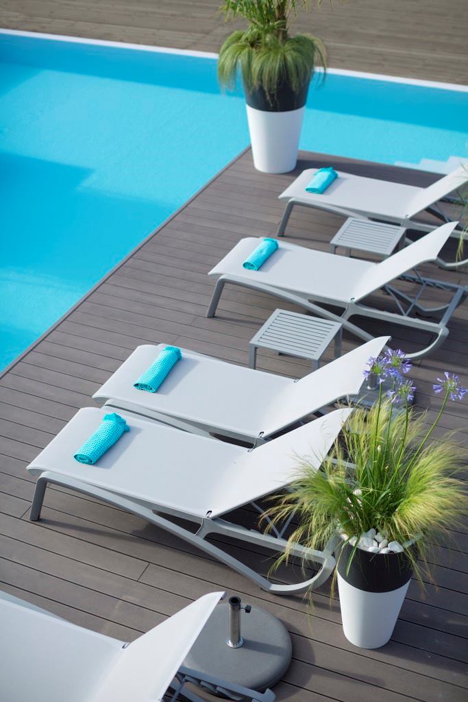 Grosfillex makes the Sunset Chaise lounge, which is manufactured for pool side relaxation.