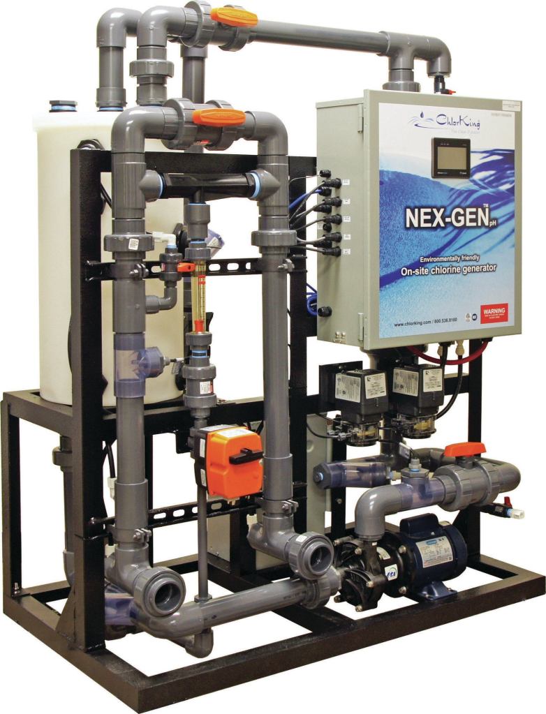 NEX-GEN, ChlorKing’s line of commercial on-site chlorine generators, uses swimming pool water to make chlorine. No salt is needed in the pool. This unique technology uses the TDS already present in the water, and can produce chlorine on-site for as low as 43 cents per gallon.